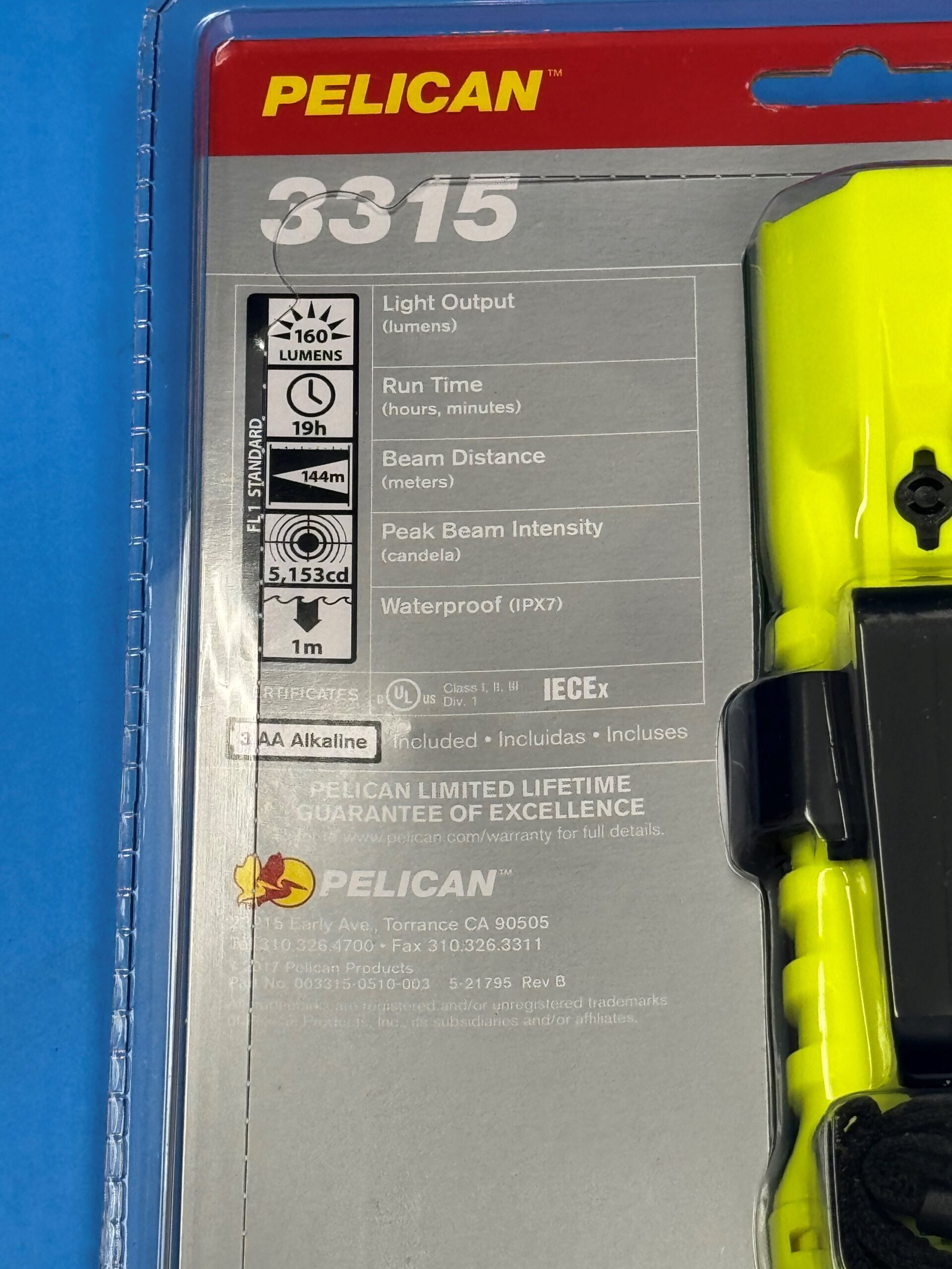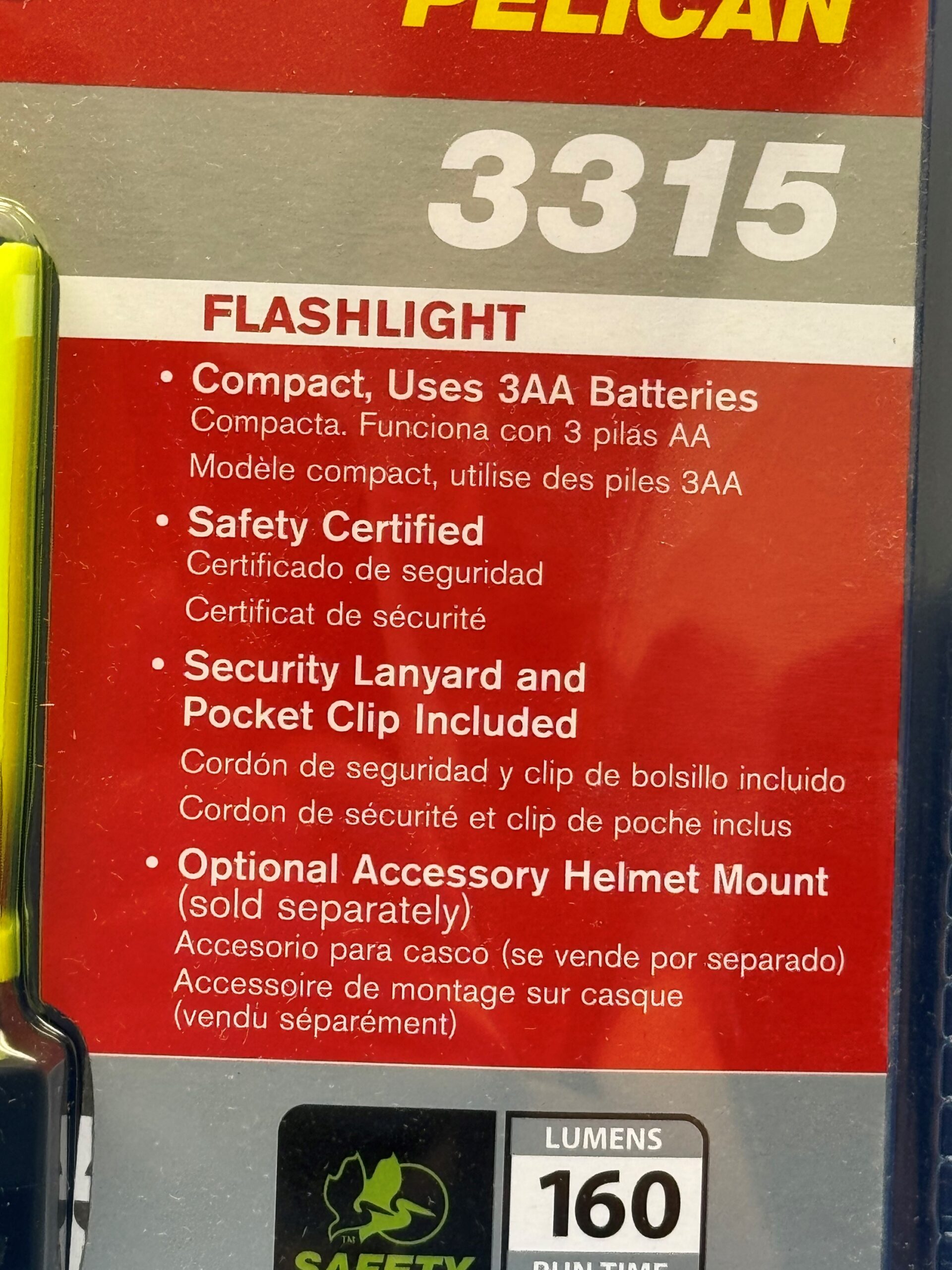 Pelican 3315 Flashlight, 110 Lumens, 3 AA Batteries Included, Yellow;